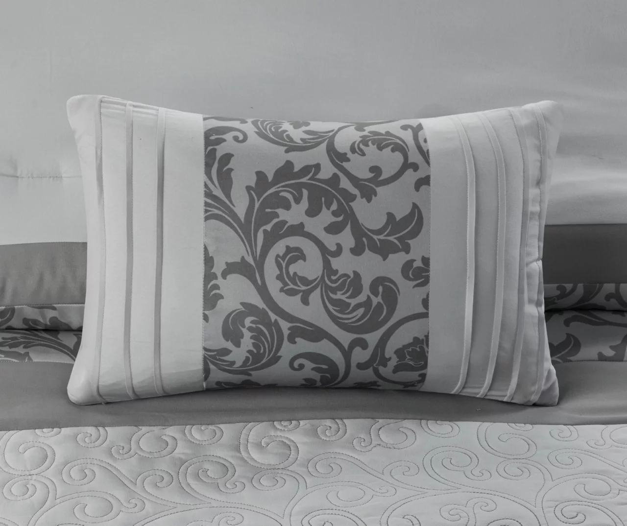 - Includes comforter, bed skirt, 2 – shams, 2 – euro shams and 2 – decorative pillows