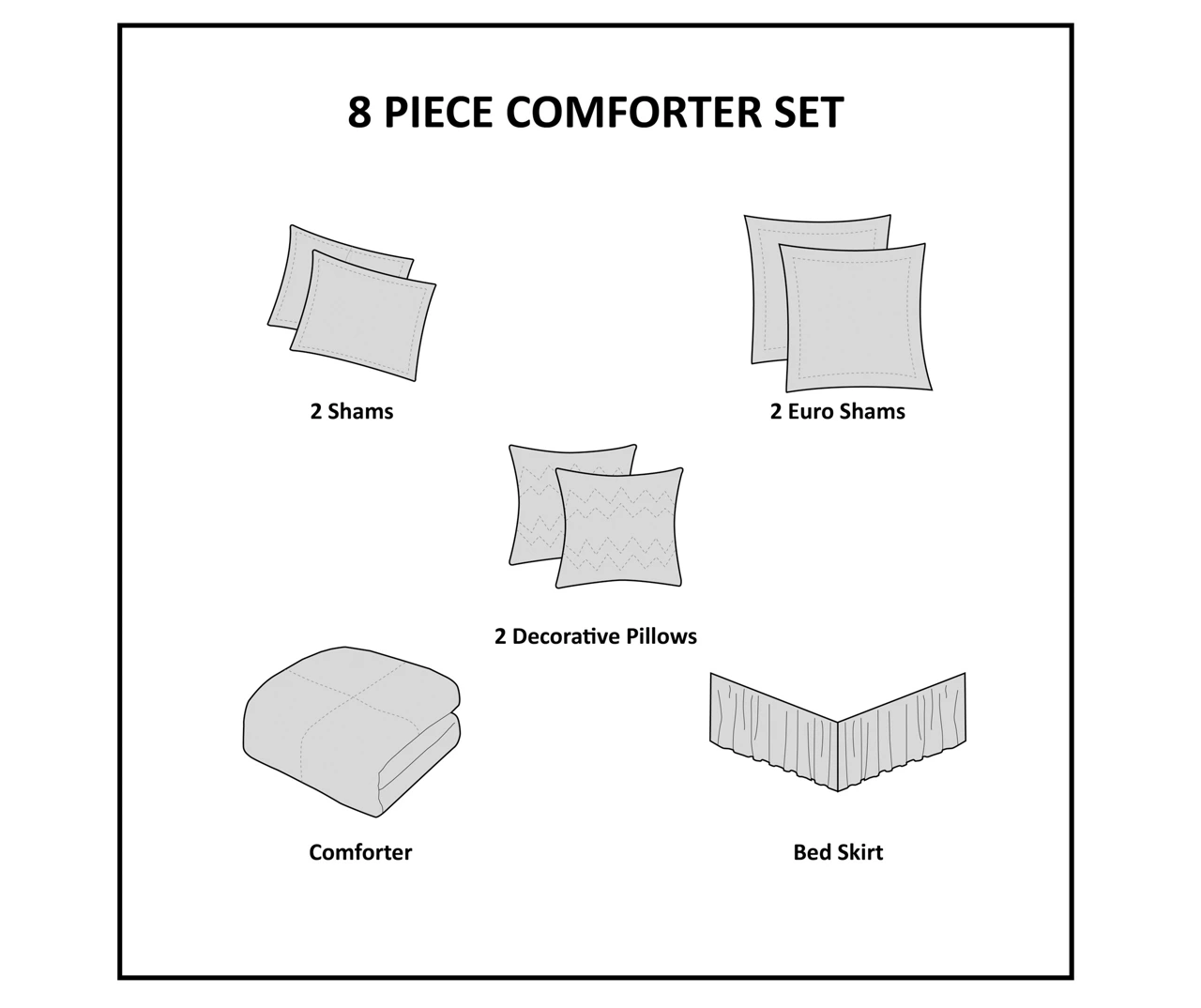 The Casey embroidered eight-piece comforter set introduces a graceful elegance to your bedroom decor. A pieced embroidery design with quilting and pintuck details adorns the face of the comforter and shams for a beautiful transitional look. Solid euro shams complement the top of the bed, while two embroidered decorative pillows and a solid bed skirt provide the perfect finishing touches. Made from ultra-soft microfiber, this comforter set is machine washable and offers a charming update to transform your bedroom.