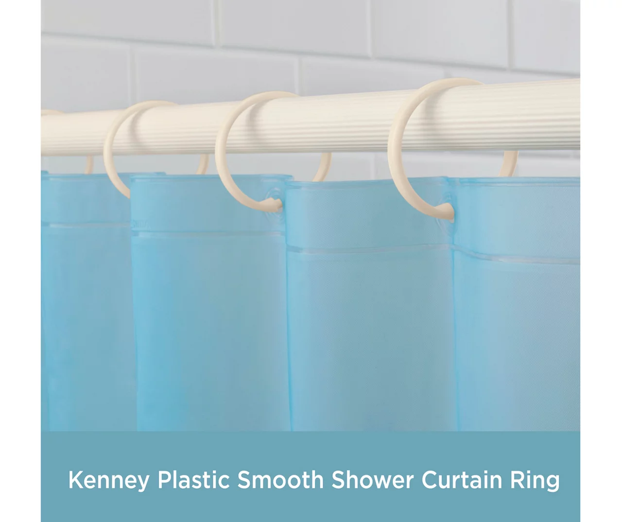 This set of smooth shower curtain rings from Kenney comes in several base colors to coordinate with many bathroom hardware finishes. Made of plastic, these shower curtain rings will not rust in your bath. These plastic rings have an easy snap closure and glide smoothly across shower rods. Each package includes 12 rings, fitting all standard shower liners and rods.
