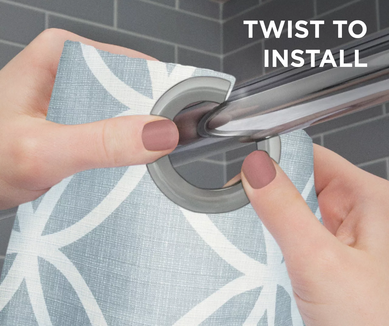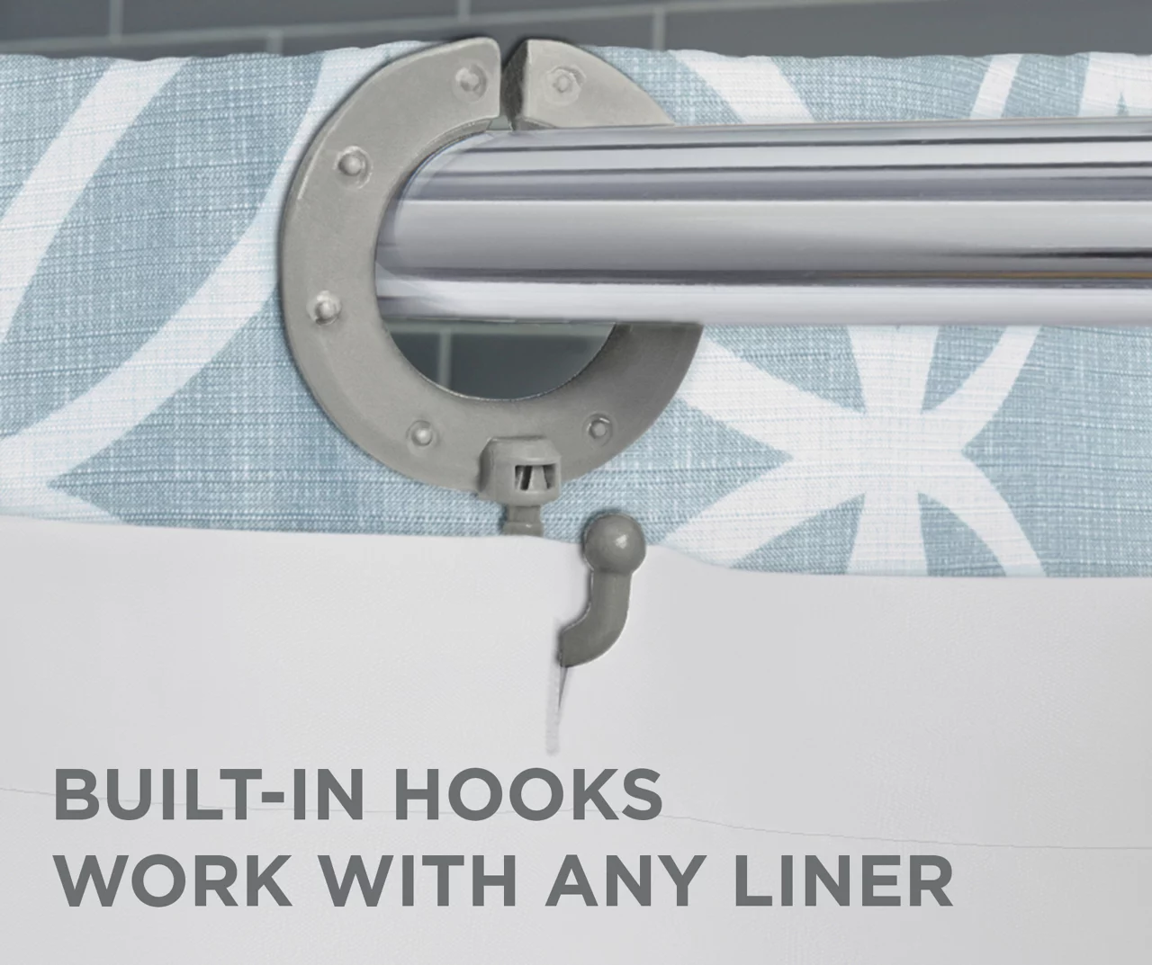 This innovative shower curtain offers an easy-to-hang design thanks to its built-in split ring top. A stylish star circle pattern is tiled across in white on a blue background. Able to pair with any liner, it’s a wonderful addition to a master or guest bathroom.