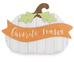 Let your love for autumn and everything it brings shine with this unique wall dĂ©cor. It features a white wooden pumpkin complete with stem and leaves and an orange banner across the center with the phrase “favorite season”. This will be sure to let everyone know how much you love the crisp fall air.