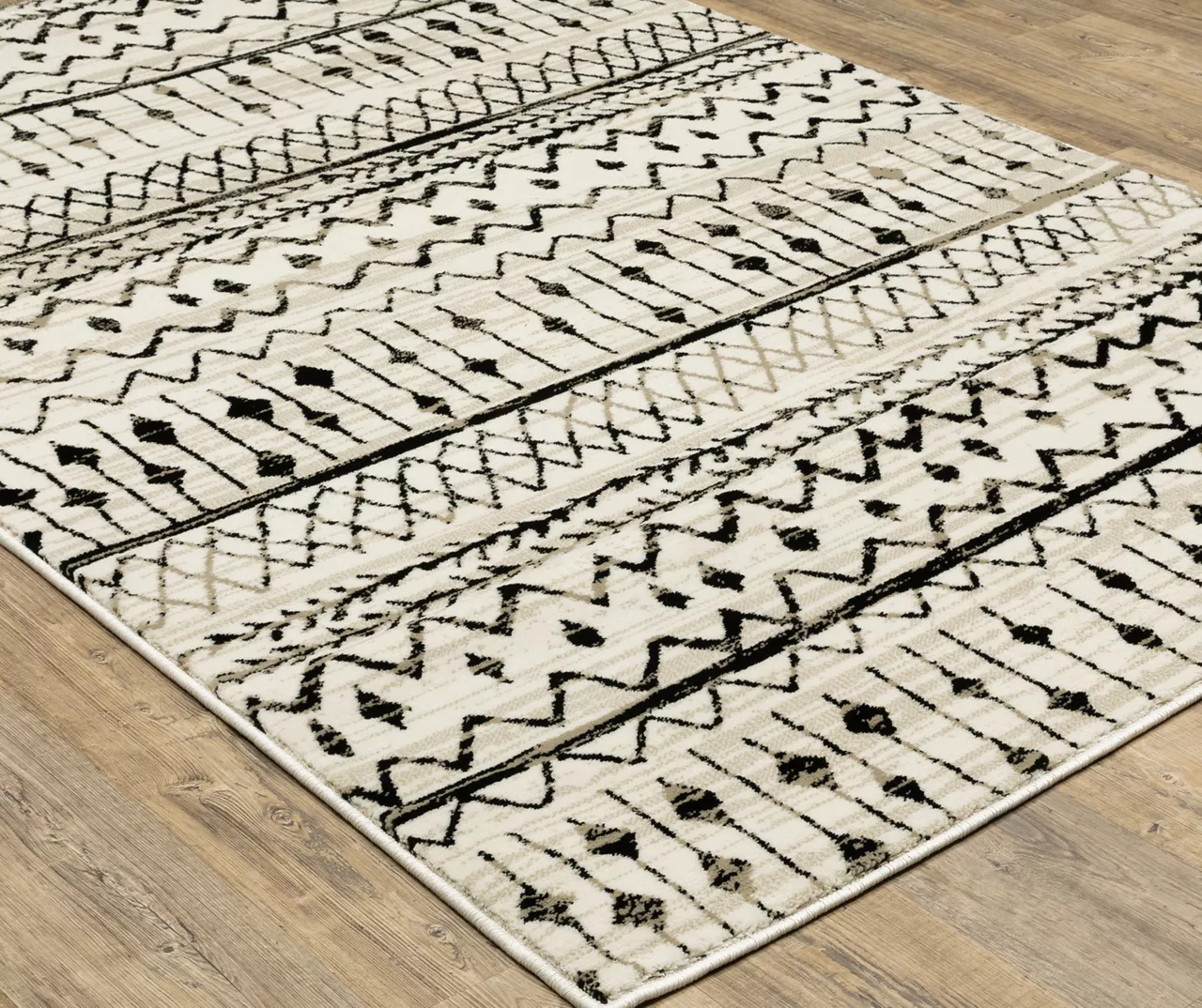 The Geoffrey collection is a power-loomed area rug that flaunts a geometric linework design inspired by American Southwest style. High-contrast black mingles with neutral beige and ivory shades for a floor spread that effortlessly and elegantly complements your style.