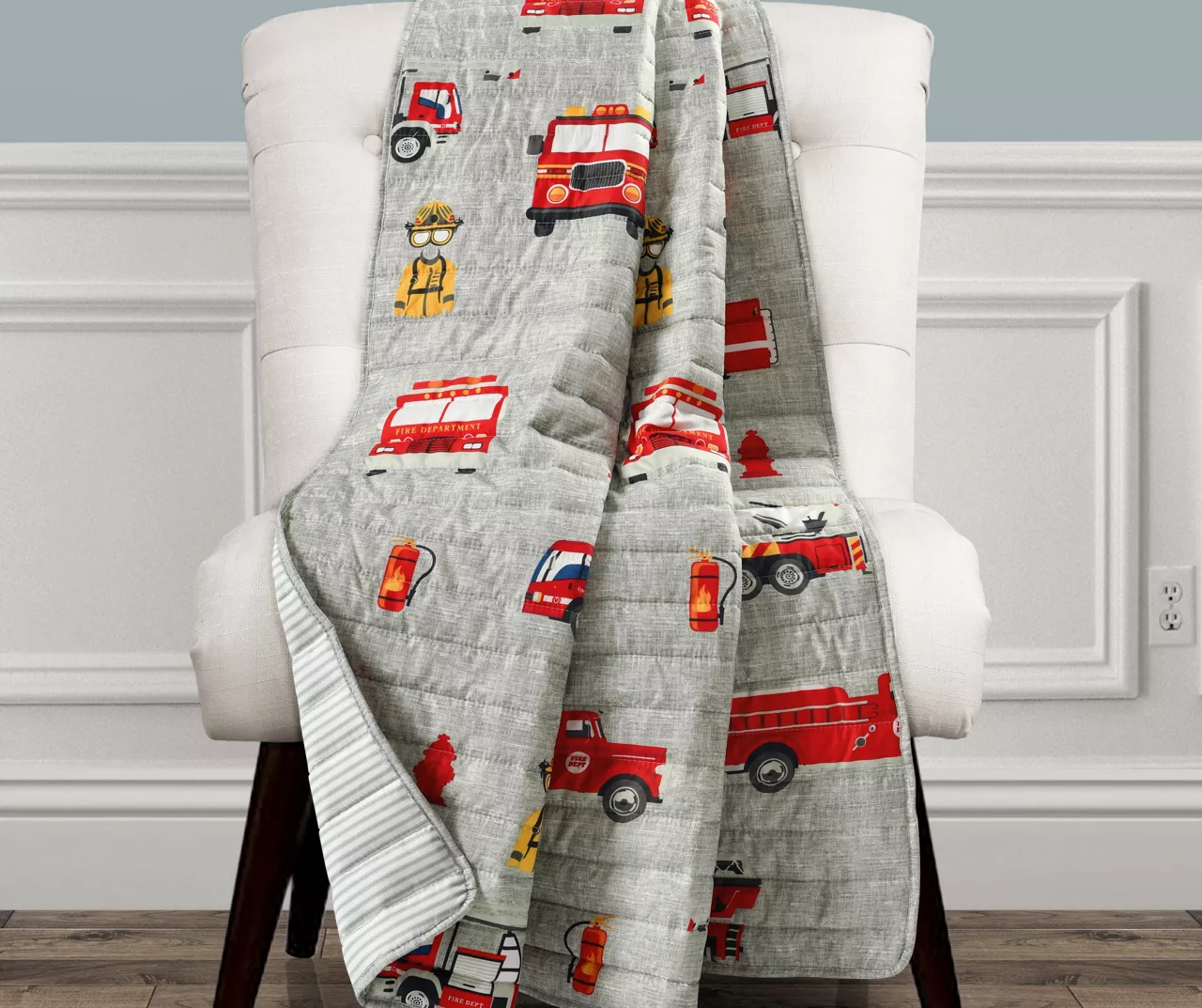 Add a heroic element to your little one’s room or play space with the firefighting motif of this patterned throw. It features a reversible design with stripes on the back side for twice the styling options, and its quilted design is sure to keep your kiddo cozy while they’re curled up with a favorite book or enjoying cartoons.