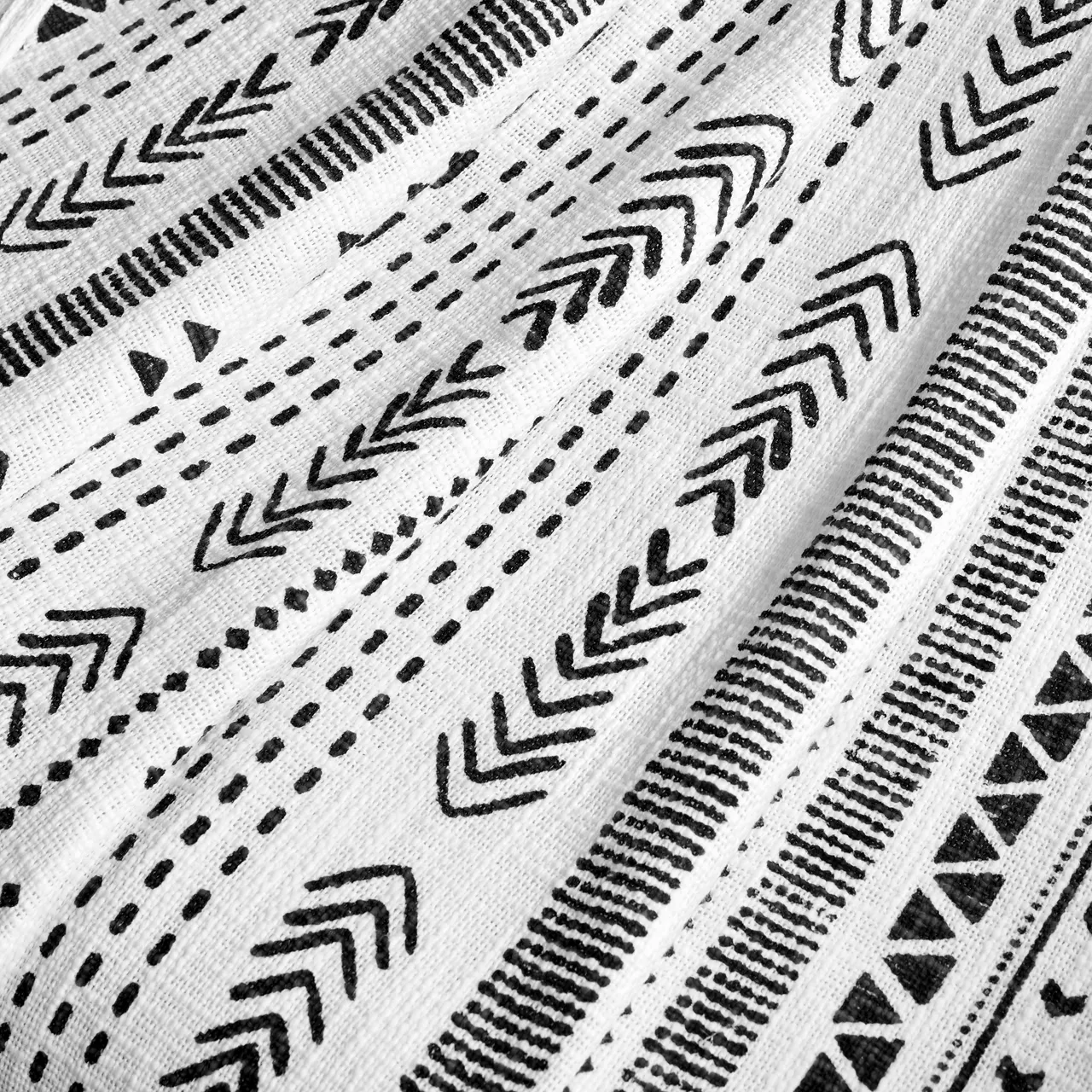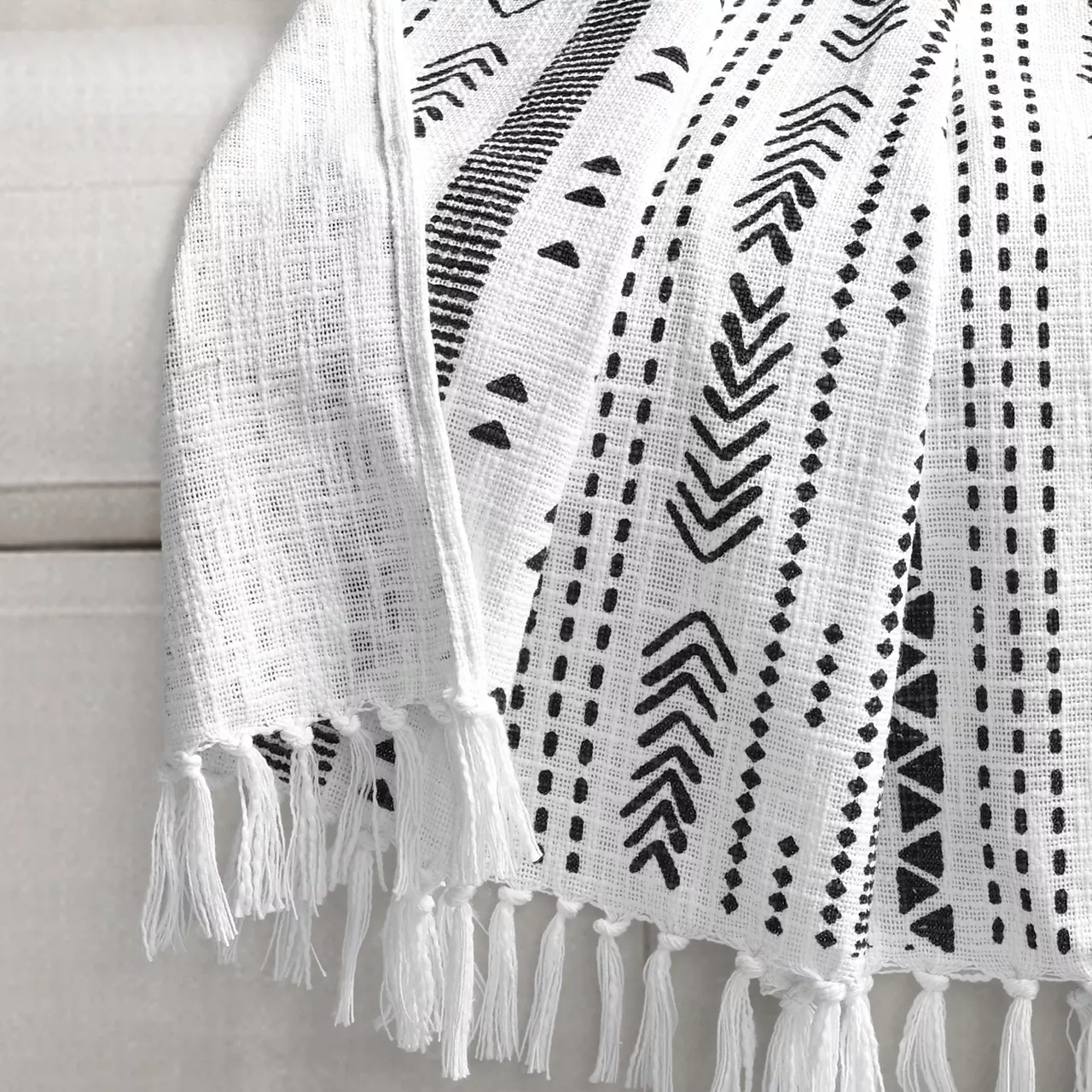 Style your living space or a bedroom with the free-spirited vibes of this cozy throw featuring rows of geometric designs in white and black hues. Tassels adorn each end for some playful panache and added boho charm.