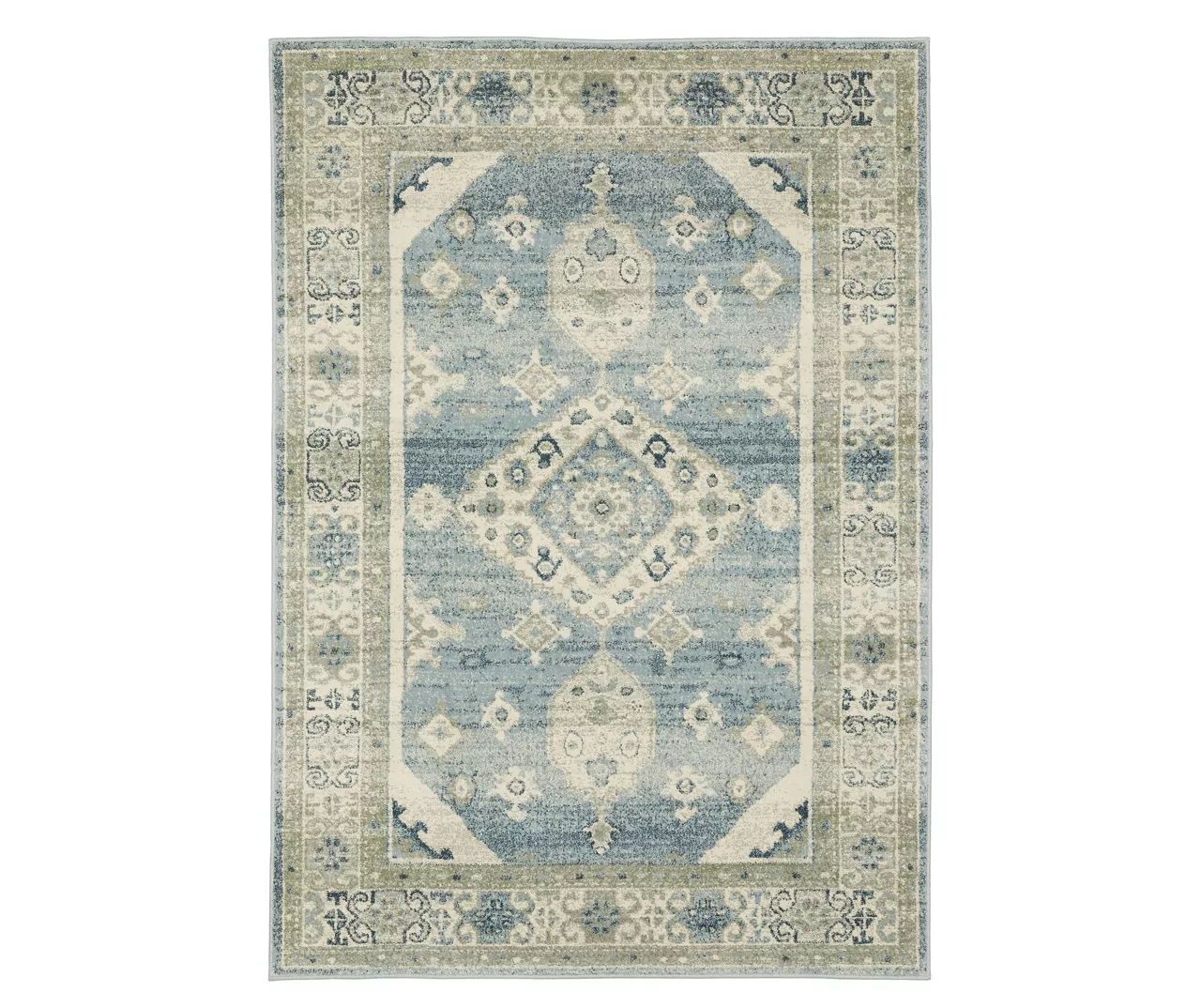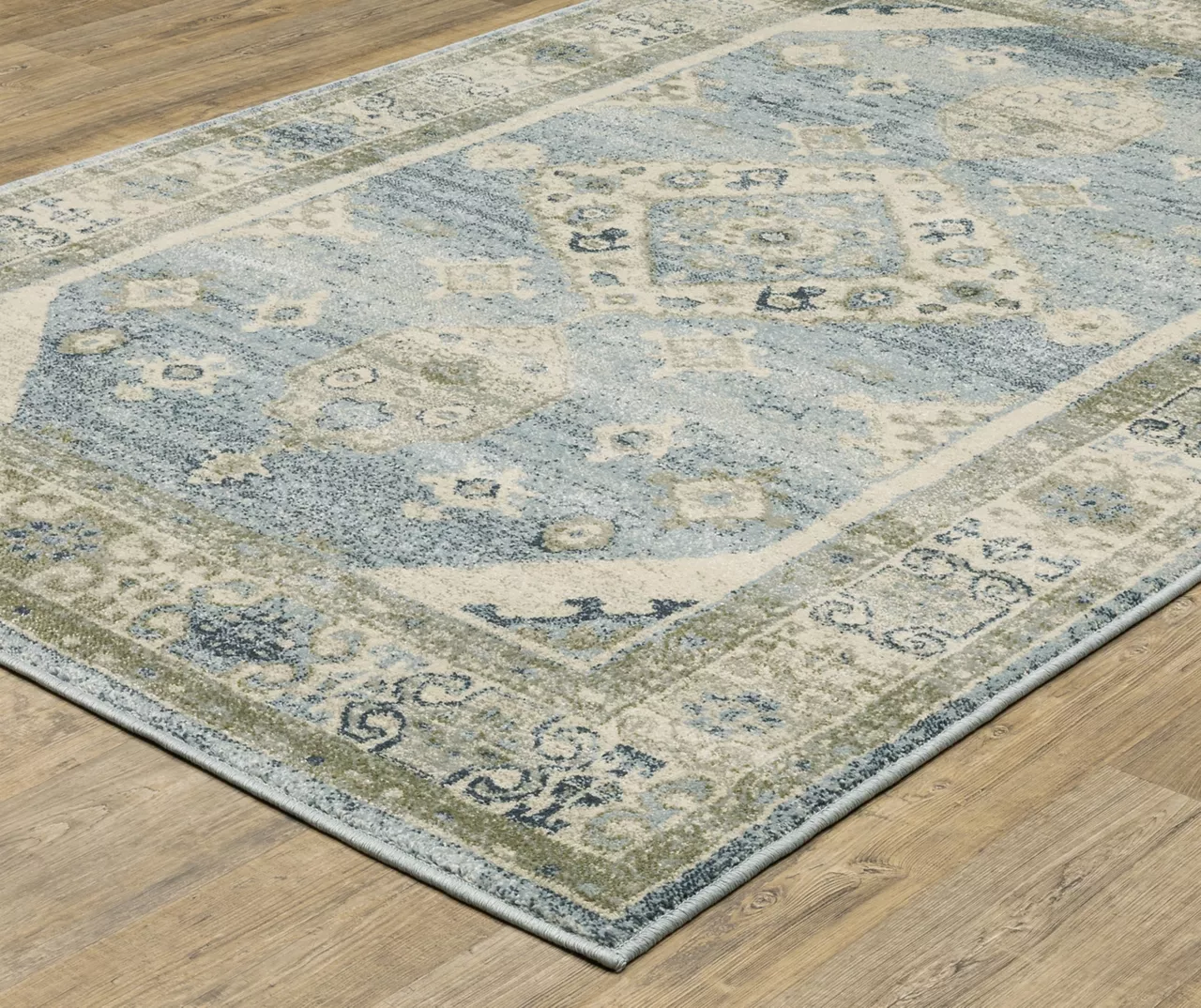 The Jefferson collection is power-loomed in the USA from tri-colored and textured polypropylene yarn. It features a traditional geometric medallion design in beautifully updated, yet classic colors of deep navy, cool soft blue, moss green and soft ivory. The multi-colored yarns add depth and visual interest to the designs and the textured effect creates a very soft feel underfoot.