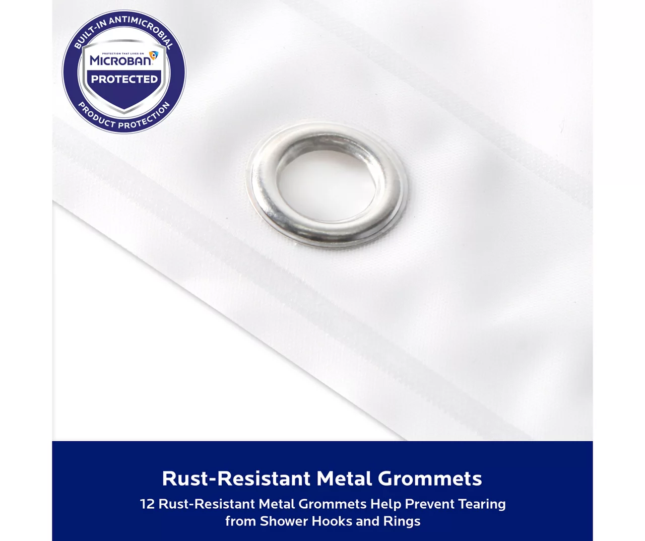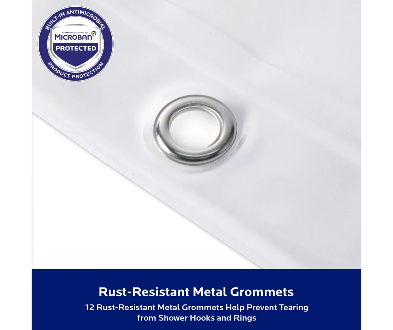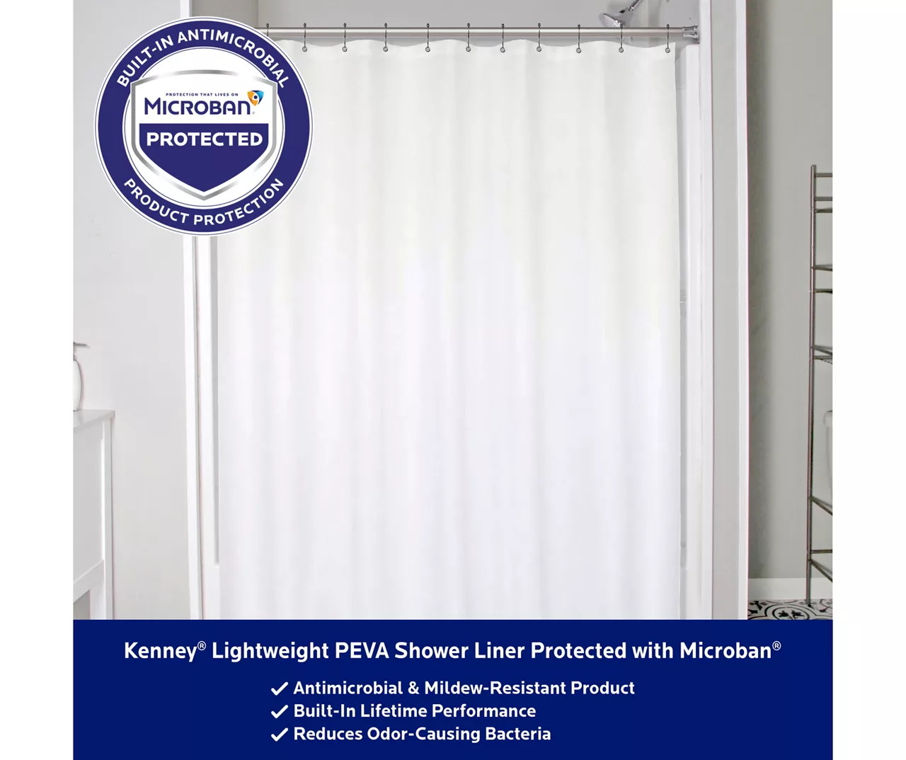This Kenney® PEVA shower liner is protected with Microban® antimicrobial* technology inhibits the growth and reproductionof odor-causing bacteria, mold and mildew and provides enhanced product protection from microbes. Microbes can cause staining and noxious odors – less microbes equals a fresher product! Protected with Microban®, this Shower Liner will remain antimicrobial* for theexpected product lifetime – the antimicrobial* properties will not wear off or wash away. The Shower Liner is made of sturdy PEVA, making it PVC-free and odorless. The liner has 12 rust-resistant metal grommets to prevent tearing from shower hooks and rings. The weighted hem on the waterproof liner keeps the liner from billowing and in place.