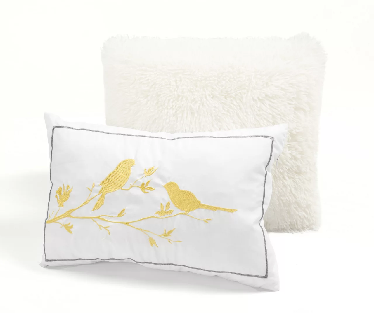 - Coordinating decorative pillows feature both a fuzzy solid hue and a yellow bird design