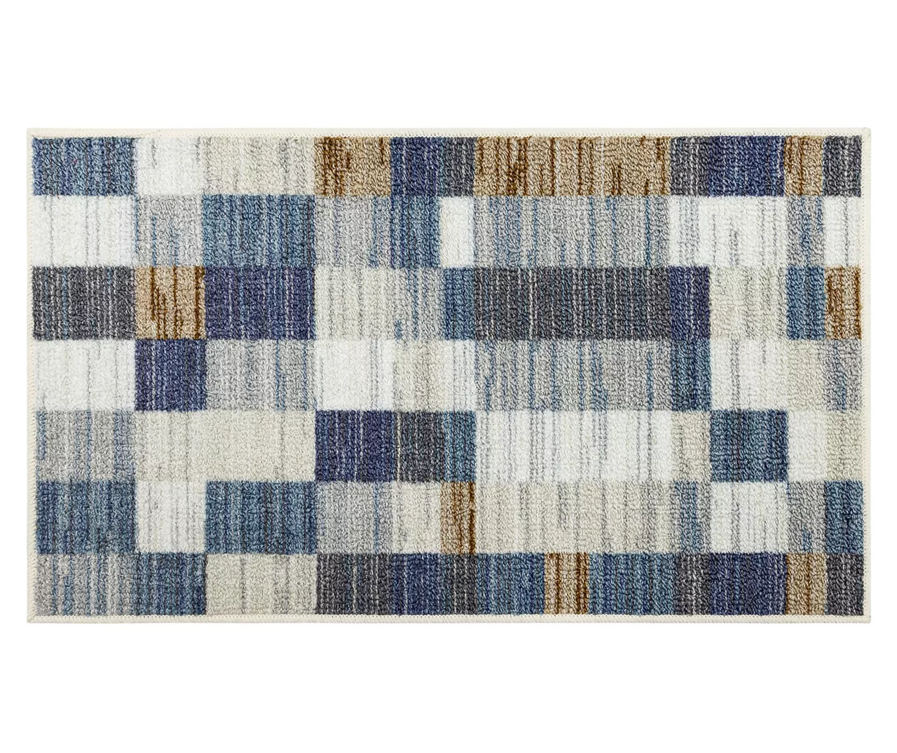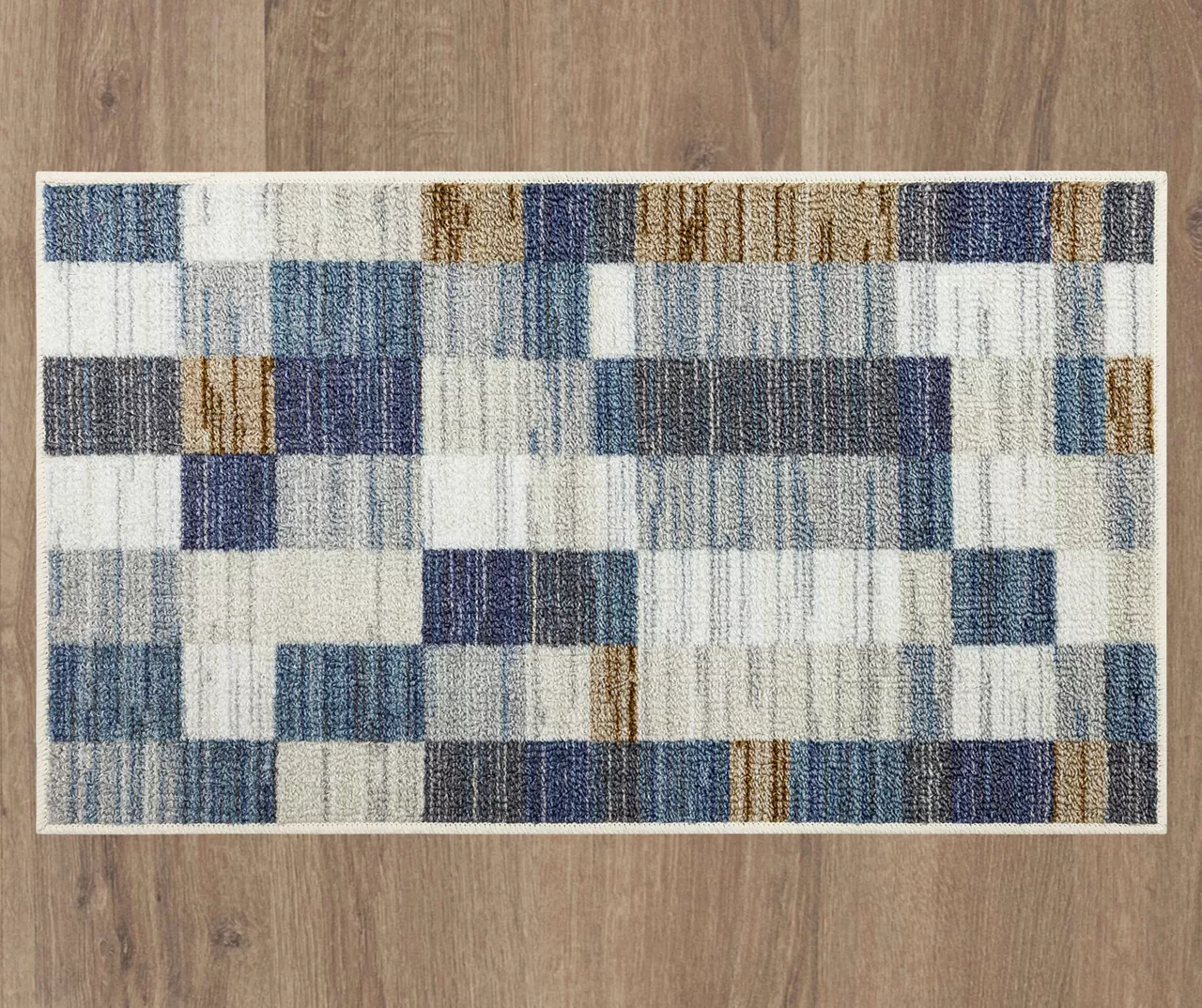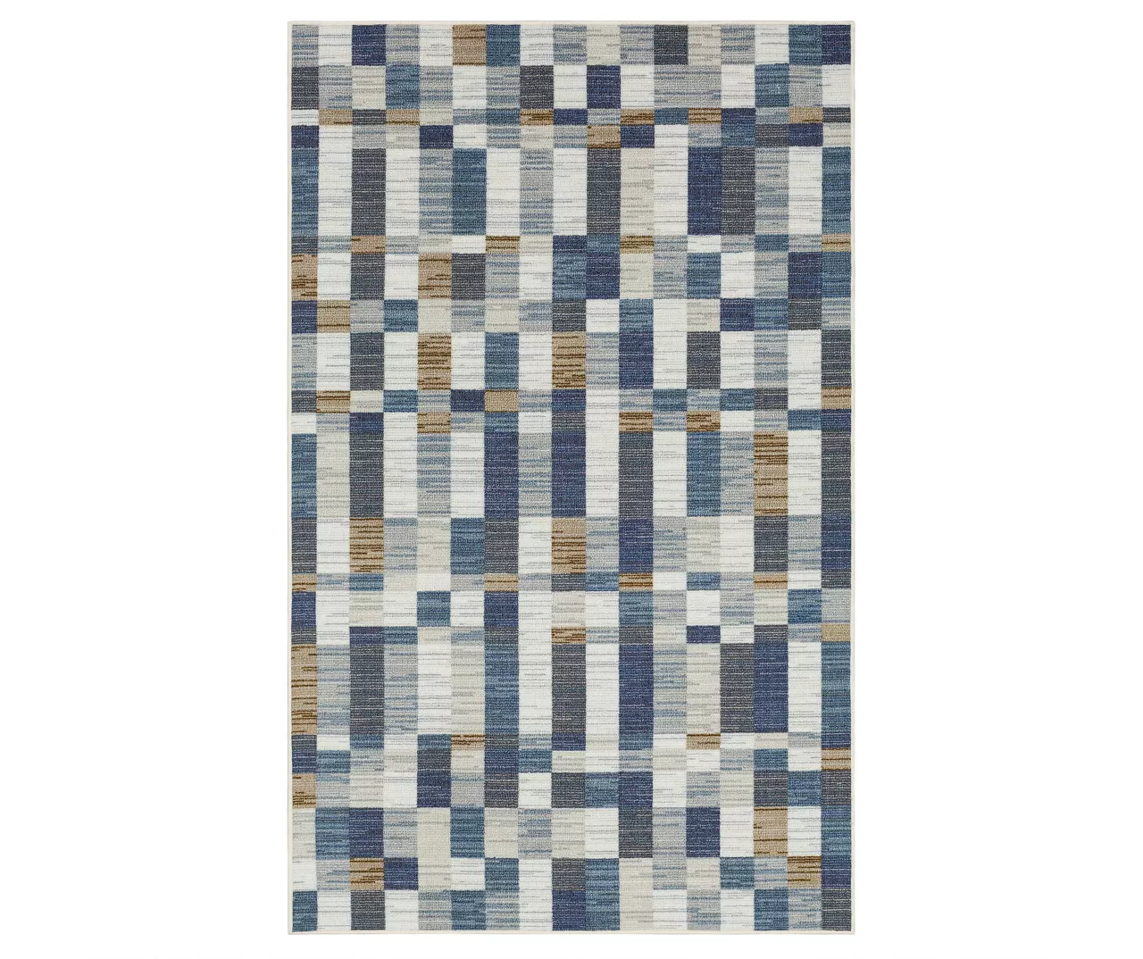 - Lined blocks pattern in shades of brown, white and blue for a contemporary look