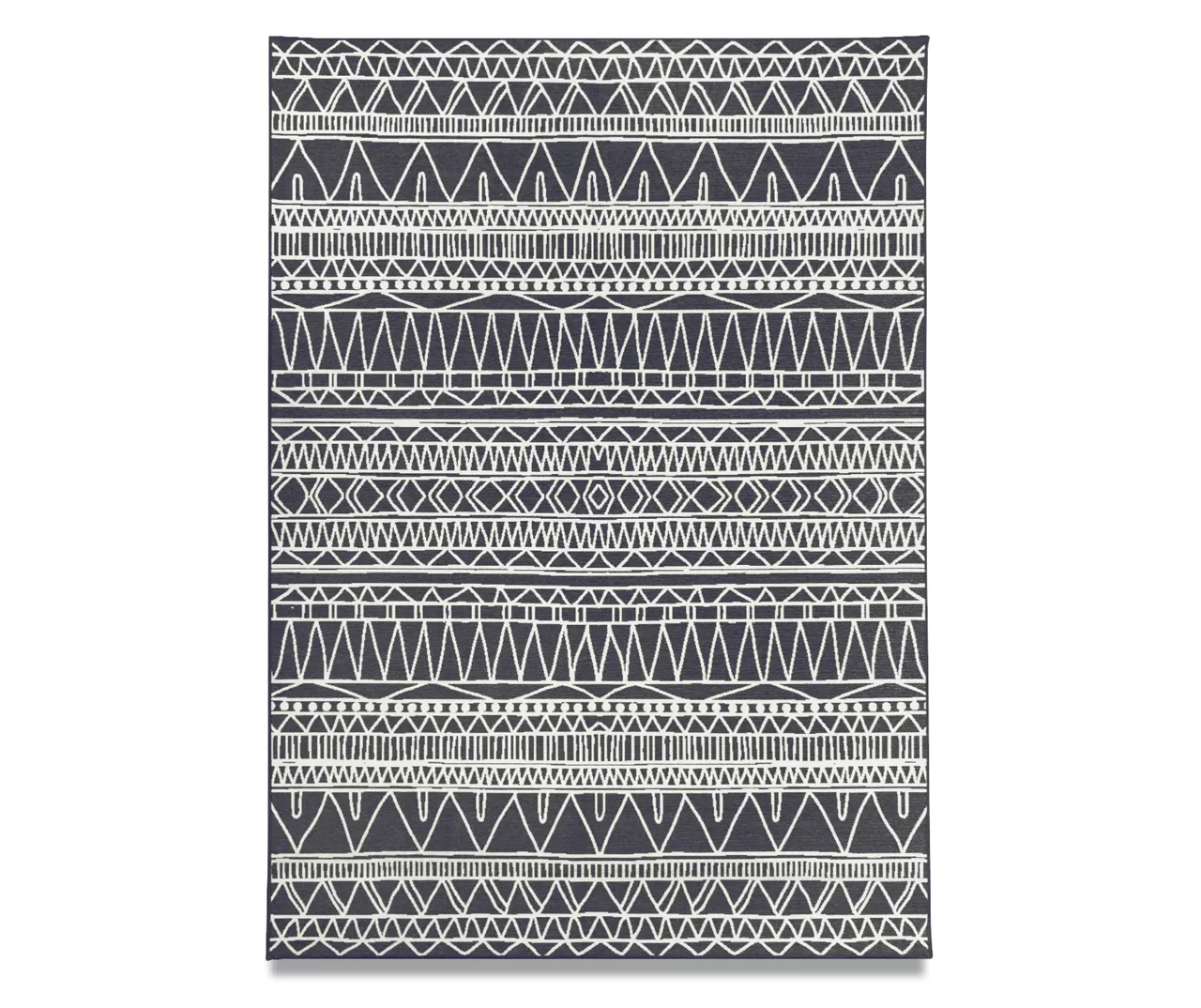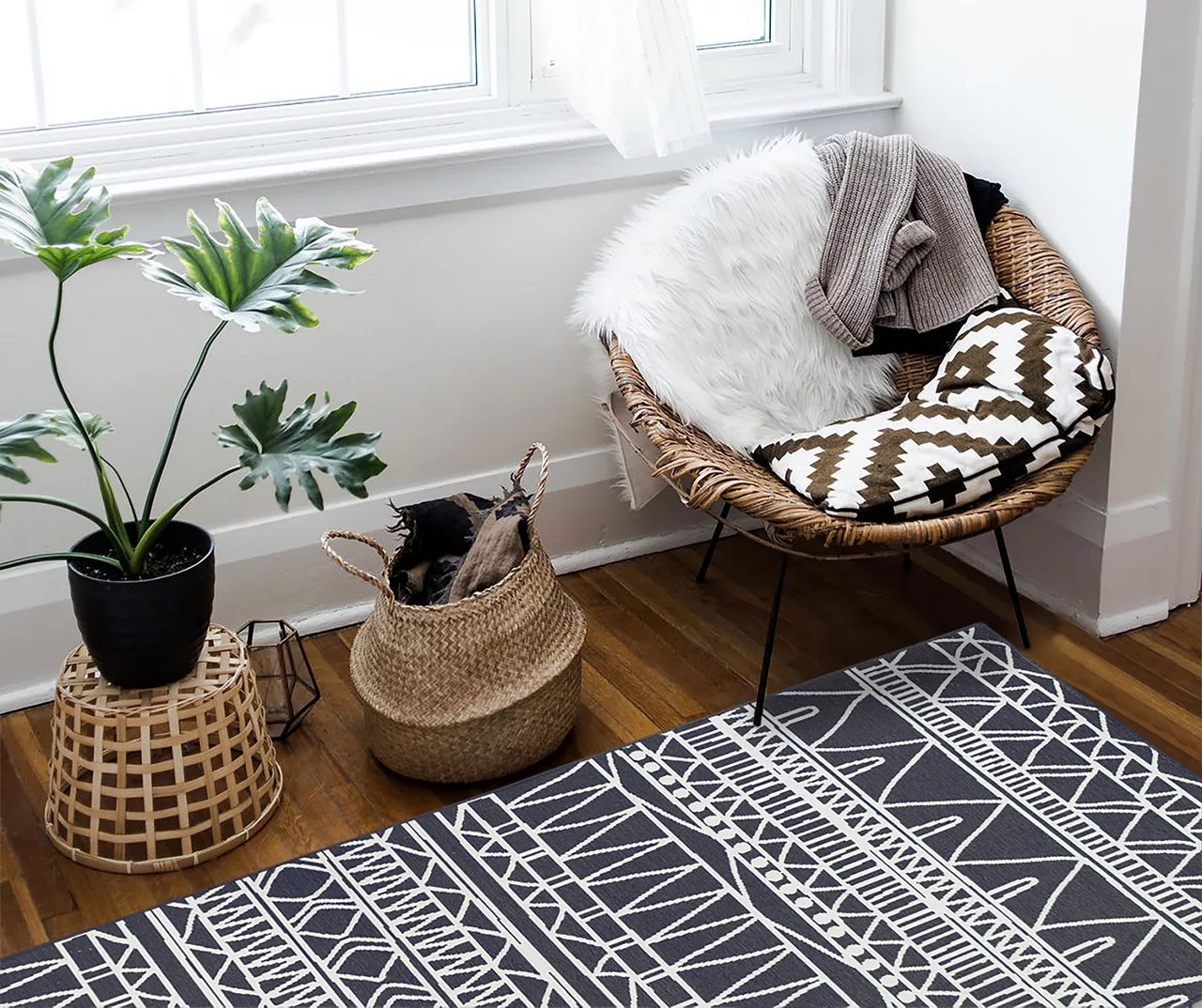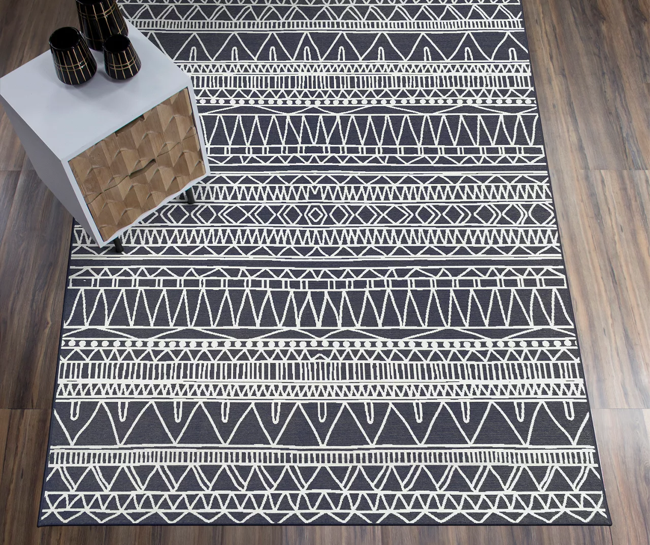 Add texture and a trendy touch to any room in your home or RV with this vintage-inspired Aztec washable rug. Featuring a gray and white color scheme, this design features lines, dashes and an assortment of geometric shapes guaranteed to add depth and interest to your space. Protect your floors from spills and scratches and wash away germs with a full line of no-fuss rugs. My Magic Carpet is an eco-friendly alternative to traditional rugs. This rug is made of non-allergenic, stain-resistant microfiber polyester, with a waterproof inner liner and a non-slip backing.