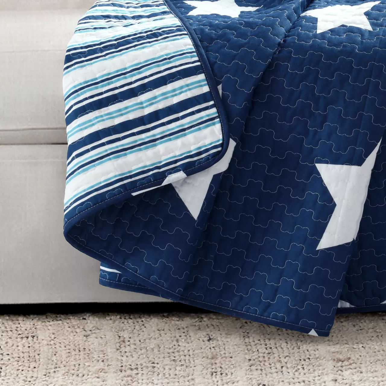 - Striped contrast on the reverse side of the quilt