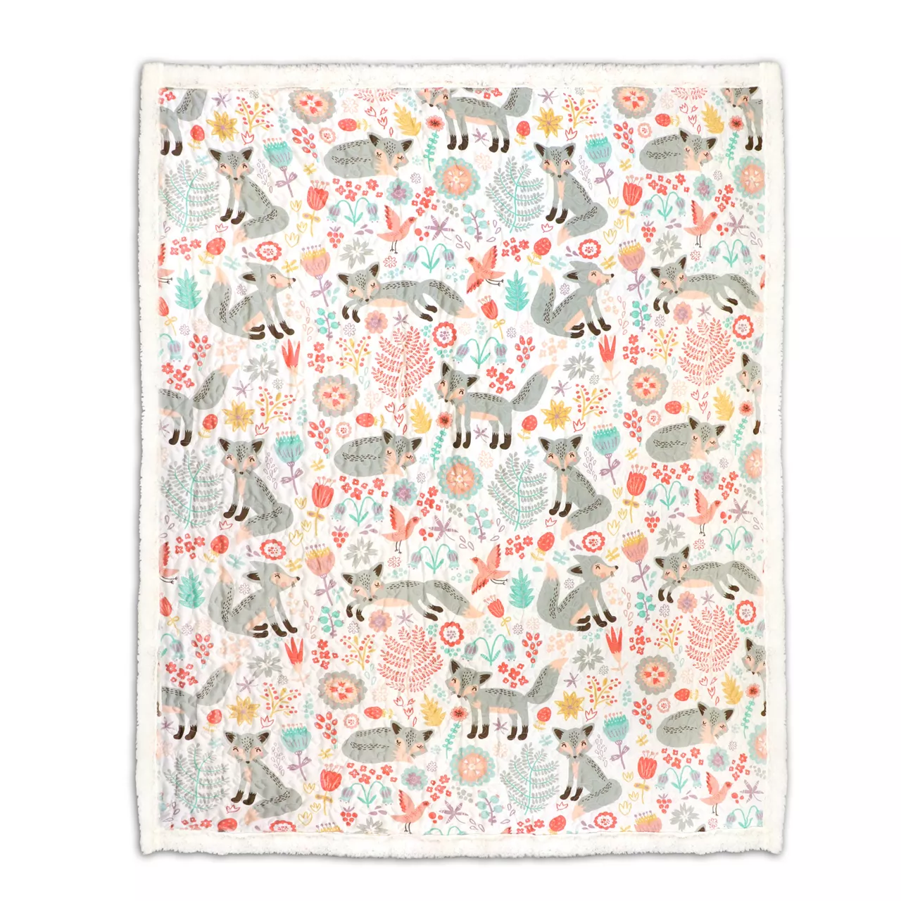 Charming pink blossoms, cheerful birds and playful foxes adorn this crisp white throw for a living space or bedroom full of woodland whimsy. Sherpa fabric trims the edges and lines the reverse side for soft comfort and warmth on cool days and nights.