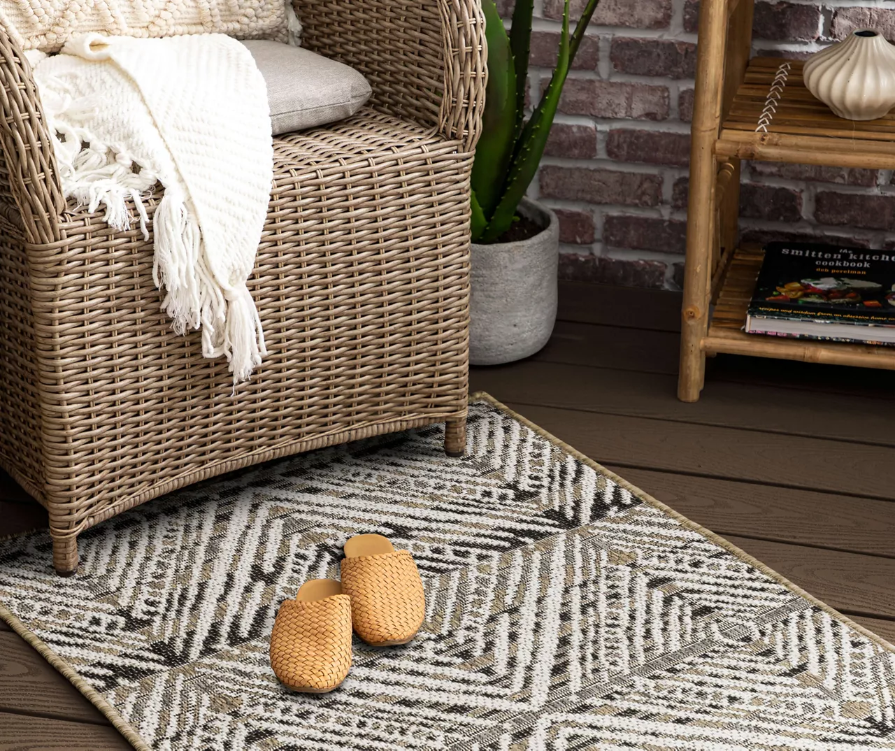 The Mohawk Home Poolside Diamond area rug features a globally inspired boho-chic design in a lovely neutral color palette. Made with all-weather olefin polypropylene yarn, this flatwoven area rug offers a detailed design, soft feel and dependable durability that works in both indoor and outdoor spaces. The resilient surface fibers are resistant to stains, fading and moisture, making it a great choice for high-traffic areas.