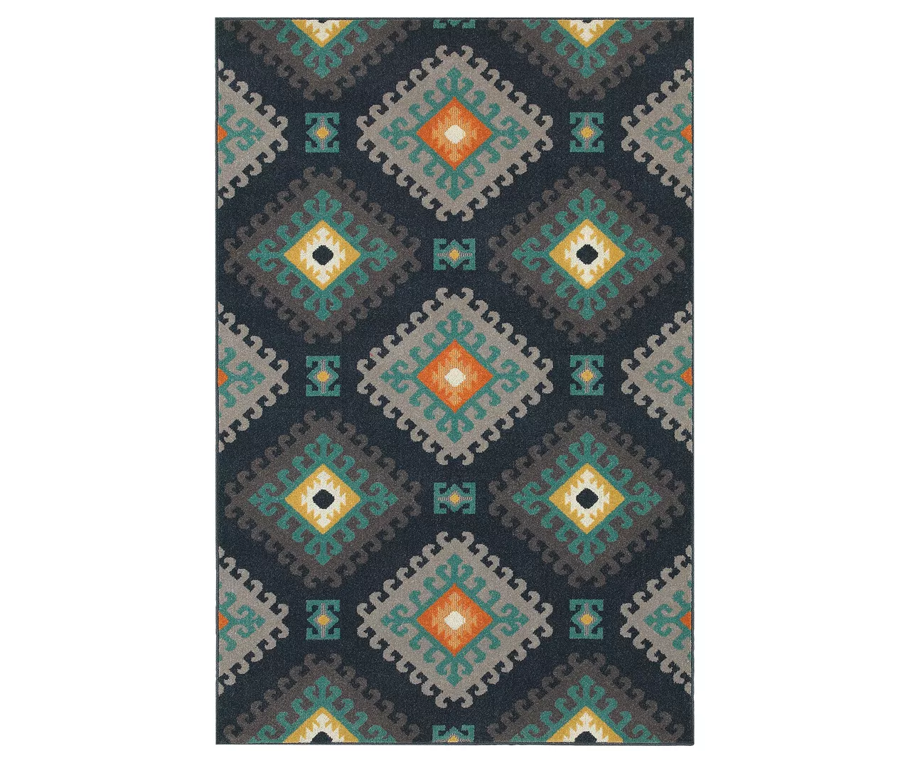 - The colors in this rug are indigo, gray, soft gold, teal, and persimmon