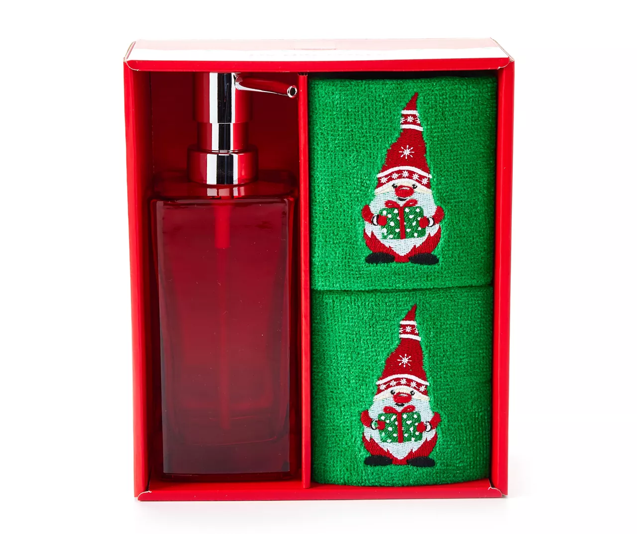 Bolster your home with very merry vibes with this three-piece set featuring two lavish cotton hand towels and a sleek glass soap dispenser. Bold colors and festive embroidered designs bring the holiday experience to your countertops, whether you opt to use this set in a bathroom or kitchen space.