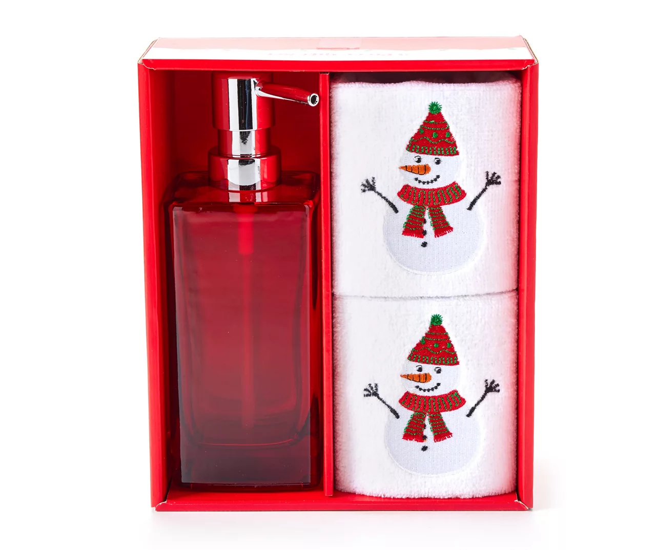 Bolster your home with very merry vibes with this three-piece set featuring two lavish cotton hand towels and a sleek glass soap dispenser. Bold colors and festive embroidered designs bring the holiday experience to your countertops, whether you opt to use this set in a bathroom or kitchen space.