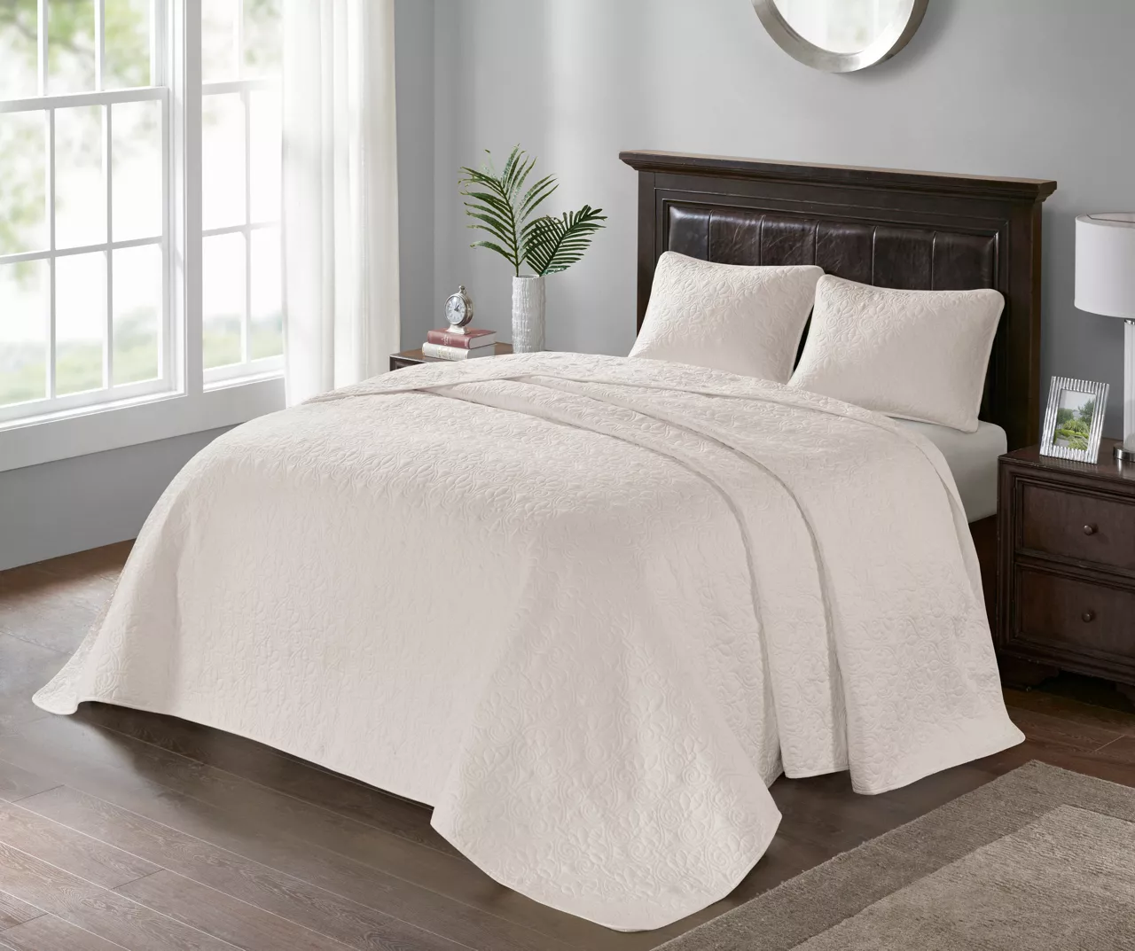 The Vancouver bedspread set offers a charming cottage-inspired update to your bedroom. The reversible bedspread and shams flaunt a classic stitch pattern that creates a rich depth and texture on the face of the bedding set. Prewashed cotton filling provides added comfort and durability, while the oversized dimensions allow the bedspread to drape better. The bedspread also has an antimicrobial treatment that helps provide built-in freshness protection to keep fabric lasting longer.