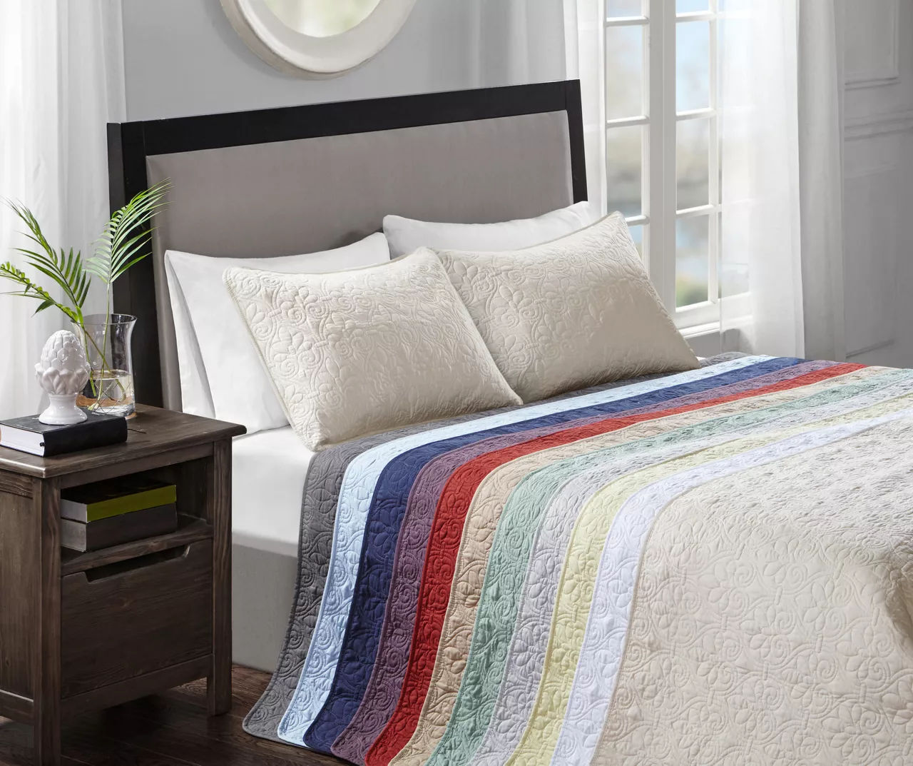 The Vancouver bedspread set offers a charming cottage-inspired update to your bedroom. The reversible bedspread and shams flaunt a classic stitch pattern that creates a rich depth and texture on the face of the bedding set. Prewashed cotton filling provides added comfort and durability, while the oversized dimensions allow the bedspread to drape better. The bedspread also has an antimicrobial treatment that helps provide built-in freshness protection to keep fabric lasting longer.