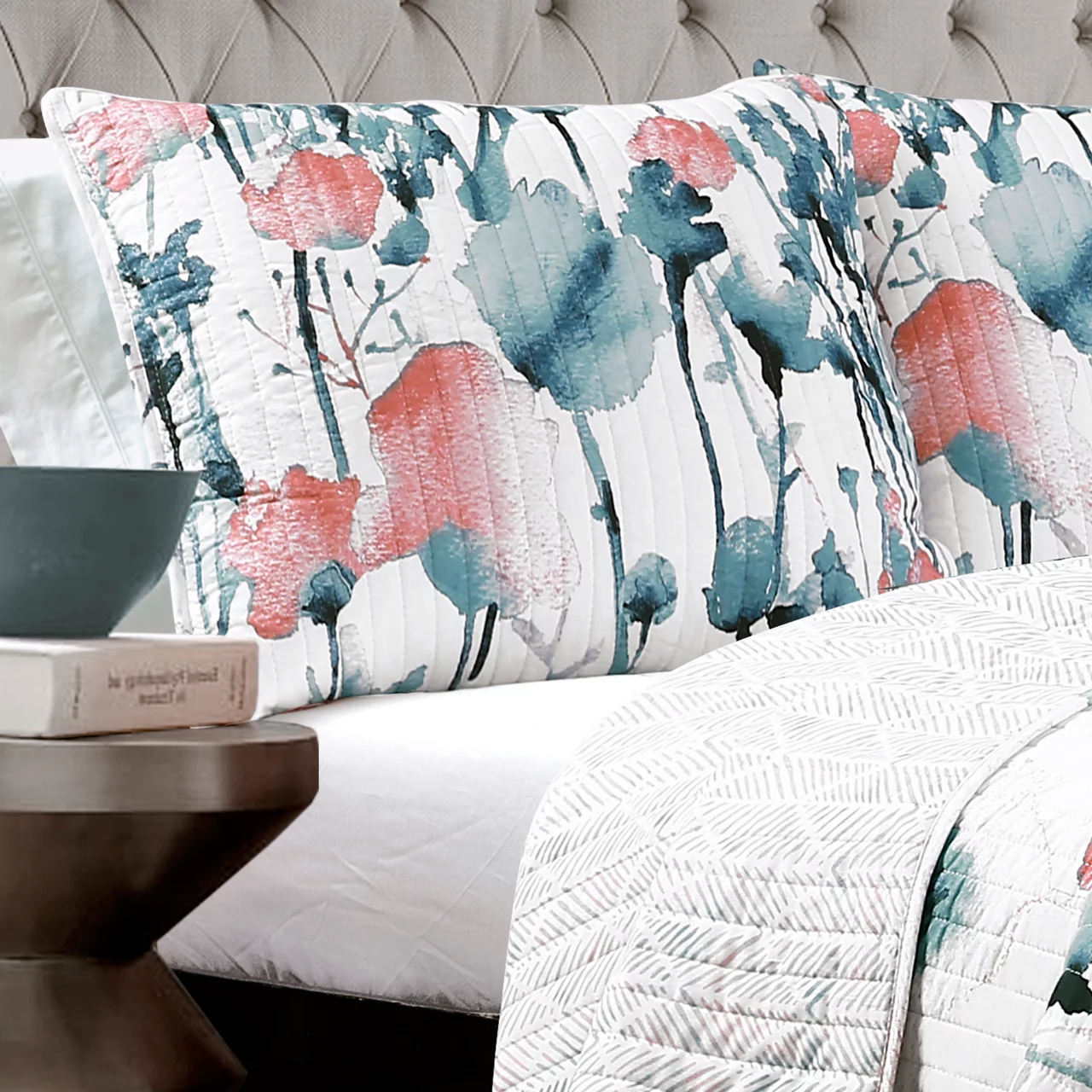 Coral blossoms decorate this set to bring elegant garden style to your bedroom, and a rose pattern adorns the reverse side of the quilt. Crafted from cozy and breathable cotton fabric, this quilt set is the perfect way to instantly brighten your room or a guest room.
